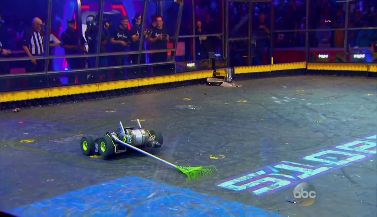 One final hit blows Warrior’s asshole wide open and sends the heavyweight into the great beyond. In a brief moment of clarity, Hypershock looks around the Battlebox at the amount of carnage and murder it’s unleashed and feels a tinge of remorse. Remorse for the cleanup crew by the way, not Warrior Clan. Using its rake, Hypershock starts sweeping up Warrior Dragon’s parts into a nice pile before pushing Warrior over to the Pulverizer to make sure the robot dies this season exactly like it did last year because running gags are funny.