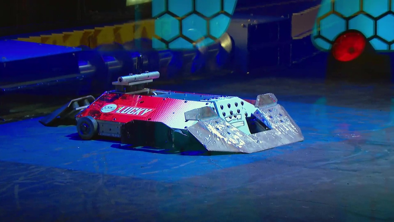 Lucky really is hurt though because after that valiant recovery and run it’s begun to lose mobility and can only pivot around. Son of Whyachi cruises in to finish off what was left of Lucky’s rear wedge… and then finishes off even more of it… and still finds even more to rip off. It’s just inventing shit to destroy by this point. It also catches Lucky’s other back tire in the process and rips it off but this doesn’t really change anything because after being thrown across the floor Lucky is still pivoting exactly as it was a few seconds ago. Kenny Florian urges Lucky to throw in the towel but he oughta know “there’s no tapping out in BattleBots”. Lucky’s fucked. Son of Whyachi has a reputation to prove after getting sunk by Brutus in record time and doesn’t let up on the poor Canadians even as the referee starts counting their robot out.