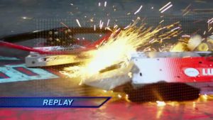 Nope, not stuck. But the situation is worse because Overhaul has its forks raised straight up and Chomp’s inner, uh, hammer “hug zone” is perfectly down around them. Miraculously these two robots don’t get tangled up and require the fight to be stopped. Chomp falls off of Overhaul’s lifter and futilely tries righting itself as it gets shoved into the wall a second time. Kenny starts talking about that suplex shit again and while this is going on Chomp almost catches the break it needs, Overhaul sticks itself on the spike strip almost exactly how it got jammed in its previous match against SawBlaze. You can tell Chomp smells blood in the water because it wastes no time trying to line up a shot, but Overhaul manages to back away at the last possible second. Chomp might be running on some kind of autonomous mode right now, because as Overhaul flees it crashes into the side of the screws before adjusting itself and carrying on… and Chomp does the same exact thing. Almost as if it were copying Overhaul’s movements 1:1? Eh, nevermind; Chomp appears to get stuck or something because it starts blowing flames and swinging its hammer for apparently no particular reason.