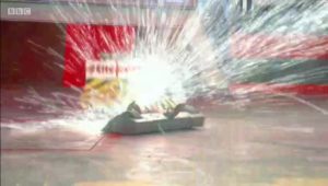 Every time these bots have met in the past Carbide always jacks up one of Eruption’s wheels and that’s basically the end of it. This is the third time they’ve fought and Michael Oates is determined to not fuck it up again. Eruption is quick on its feet but it’s biding its time and starts using all of the added armor on its front end to slowly wear Carbide out and destabilize it. There haven’t been any flips yet but already Carbide is ricocheting off in dangerous angles as its blade gets deflected by Eruption’s wedge. Angela Scanlon suspects maybe the flipper is dead after that first big hit, Jonathan Pearce seems to agree. But it’s not dead, Eruption is just waiting for the perfect moment and that moment just so happens to be right when Sam Smith mutters that Carbide has started smoking slightly. Eruption lets loose with the CO2 and the reigning champion goes reeling. Carbide’s bar continues to work but it’s apparent that there’s a little less muscle behind its lesser hits now. One last huge hit causes a few more puffs of smoke to come out of the robot before Carbide’s blade stops working and the robot gets flipped upside down.