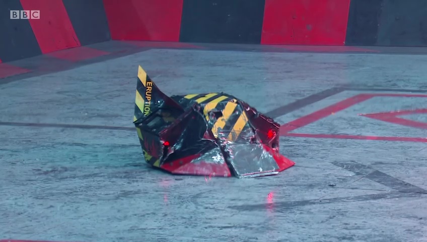 Behemoth has absolutely caught a second wind this series. All too often old robots that continue to compete years after their prime eventually start to fall in increasingly humiliating ways, but not this one. You’d think after the spaghetti apocalypse that was Behemoth vs. Cherub that Ant Pritchard would’ve disconnected from the world and spent the rest of his years living in a trailer in the middle of the woods, but he bounced right back and after an unlucky loss in the Grand Final group melee an injured Behemoth mustered a win against Magnetar to bring itself into the semifinals. But if you want to talk “second wind” look no further than Eruption, last year’s runner-up. Eruption was given quite possibly the textbook definition of “bullshit draw” and was ultimately eliminated in its heat. The robot still qualified for the wildcard rumble though, and when the dust settled there was only one robot left. Eruption. This robot was almost left for dead but when push came to shove Eruption said “fuck that noise I have a flipper”.